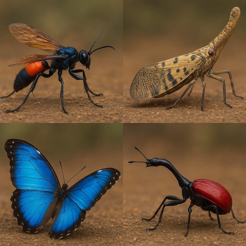 Pośród milionów gatunków wiele posłużyło się adaptacjami, które pozwalają im unikać drapieżników bądź skutecznie polować. Stick insects, popularnie nazywane patyczakami, potrafią przyjmować kształt gałązki, a liście często imitują kształtem i barwą prawdziwe liście drzew. Niektóre modliszki stosują dynamiczny kamuflaż – potrafią zmienić kolor ciała w zależności od podłoża, na którym przebywają, co czyni je niewidocznymi zarówno dla ptaków, jak i dla łatwo zauważających ruch drapieżników.
