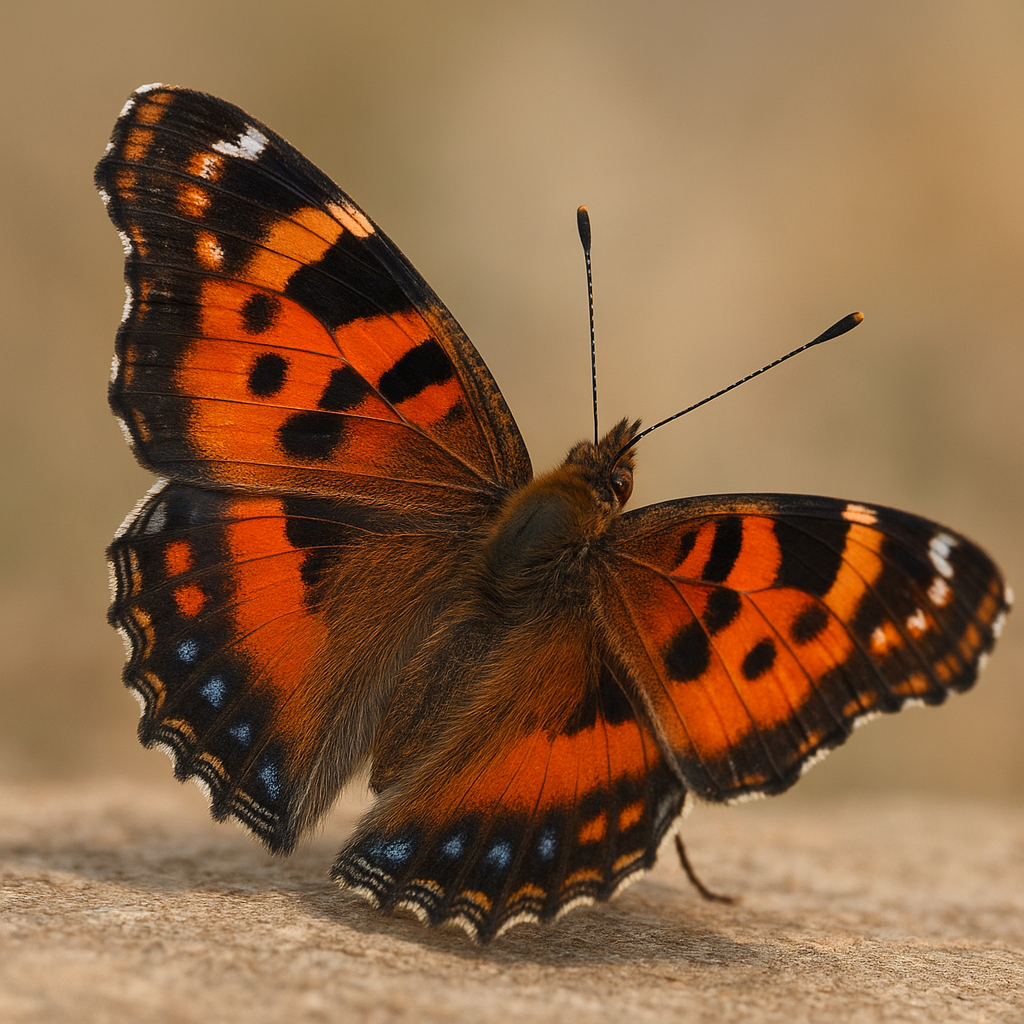 - u góry skrzydeł dominujące odcienie pomarańczu i brązu, silne, kontrastujące czarne plamy i paski tworzące rozpoznawalny wzór;