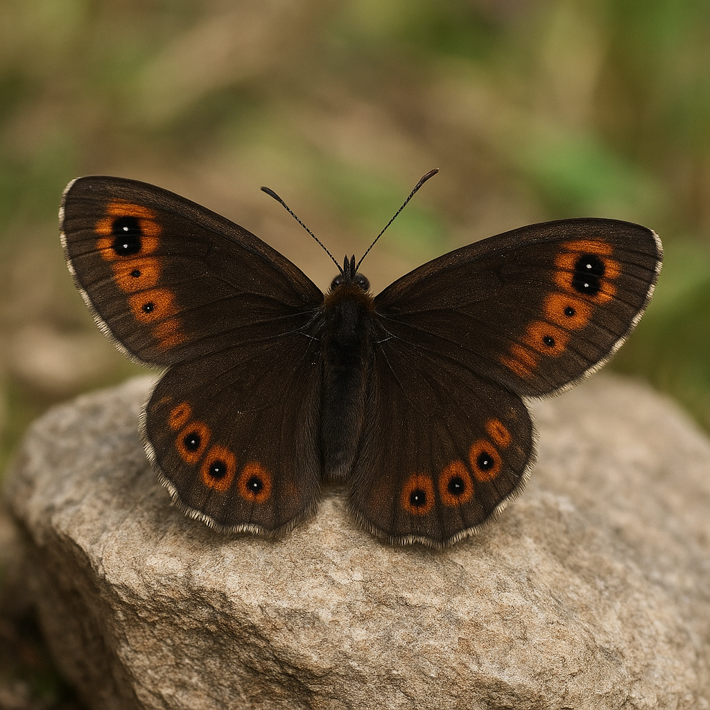 Umaszczenie jest dostosowane do środowiska kamienistego i trawiastego — wierzch skrzydeł ma barwy od ciemnobrązowych do prawie czarnych, często z wyraźnymi pasami lub półksiężycowatymi plamami o barwie pomarańczowo-rudawobrązowej. Na pasach tych mogą występować jedno lub kilka czarnych oczek (ocelli) z białymi środkami, służących jako element maskowania i odstraszania drapieżników. Spód skrzydeł jest zwykle bardziej stonowany — od szaro-brunatnego po jasnobeżowy, co ułatwia kamuflaż podczas odpoczynku z zamkniętymi skrzydłami.