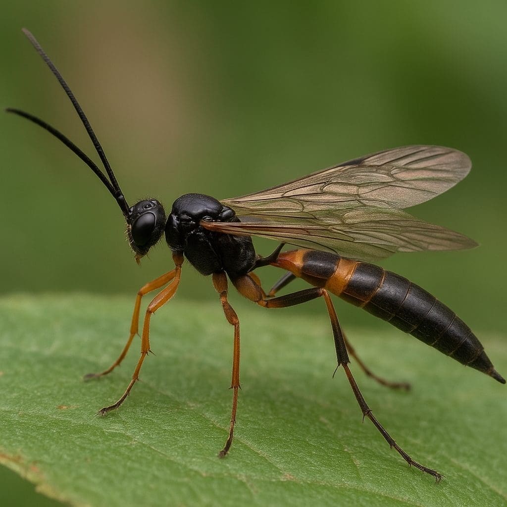 - Obserwuj kształt ciała i proporcje — ichneumon jest smukły, z wyraźnie wydłużonym odwłokiem i długimi antenami.