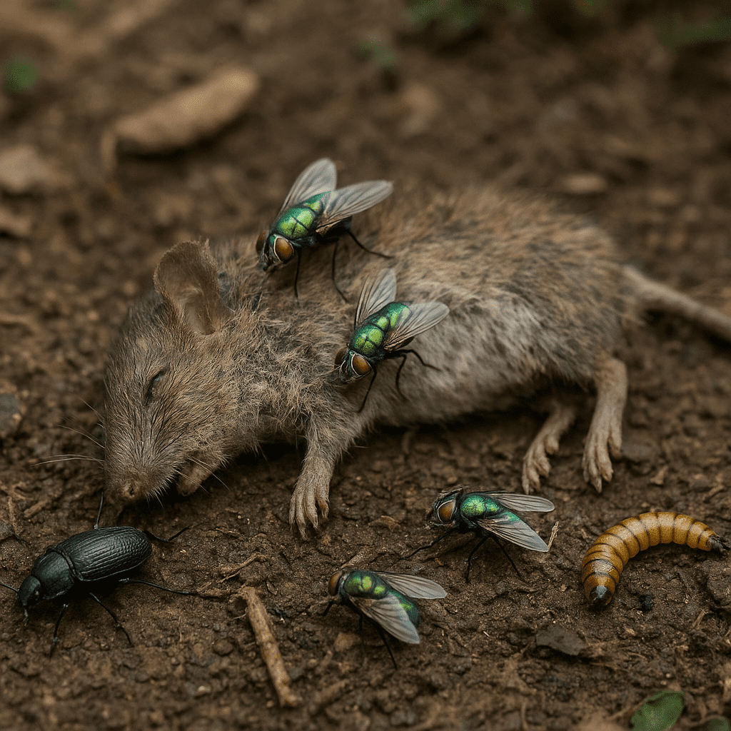 W momencie śmierci organizmu natychmiast pojawiają się pierwsze gatunki nekrofilnych muchówek, które wyszukują materiałów bogatych w białko. To właśnie one rozpoczynają intensywny etap rozpadu tkanek, przyciągając kolejne grupy konsumentów szczątków.